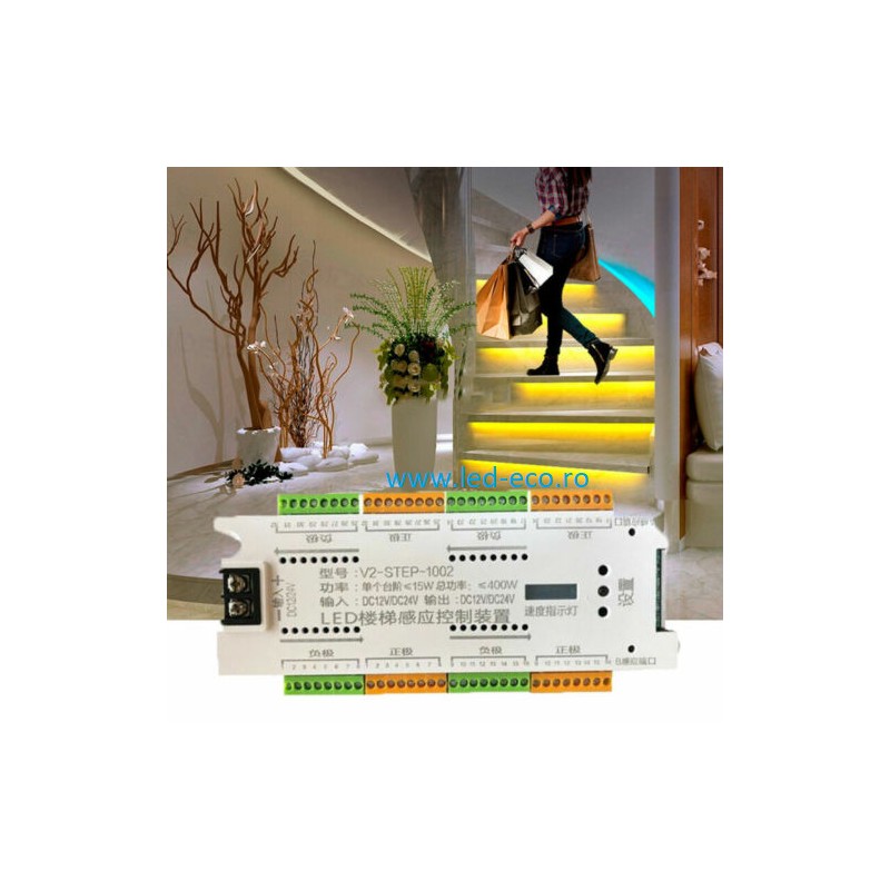 La detectarea miscarii senzorul comanda aprinderea treapta cu treapta a benzilor led iar dupa perioada de timp programata banda se stinge tot treapta cu treapta.
