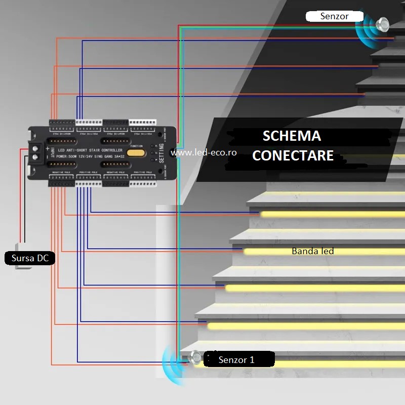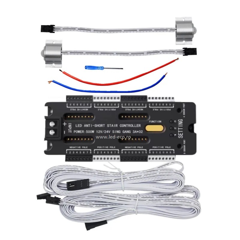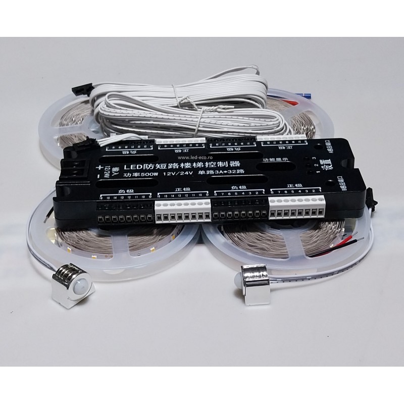 Kit inteligent iluminat scari pentru maxim 32 trepte. Controlerul inteligent se poate programa pentru minim 2 trepte si maxim 32 trepte.